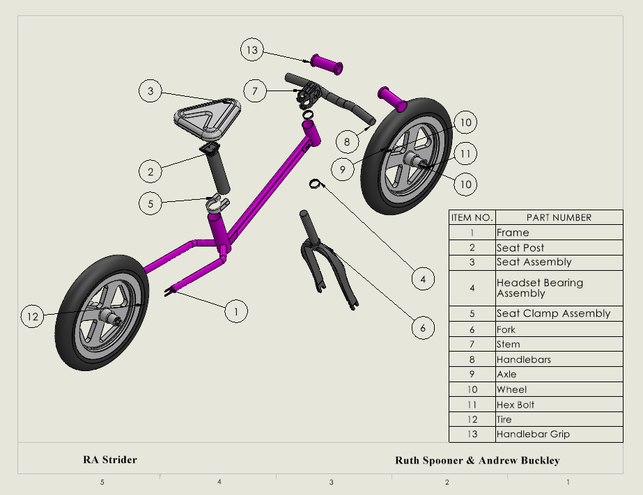 This project was completed for my Advanced 3D modeling class as the term project. The project includes a parts list, and list of subassemblies. The strider bike was modeled after the geometry of a modern dirt jumper, to give kids the playful feel, while also having a bike that fits them. The images below show both the dimetric view, as well as the exploded view. This project was done with a partner and split up into two sections. I designed the frame, wheels, seat, seat tube, and seat tube clamp. I also completed all of the drawings for each part and subassembly.